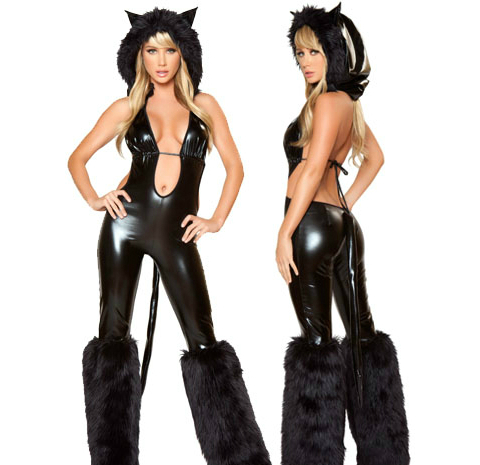 You will have them purring all night long in this Nylon/Spandex catsuit with attached fur-trimmed hood and ears, attached fur leg warmers and tail. Adjustable ties on back for perfect fit. One size fits all.