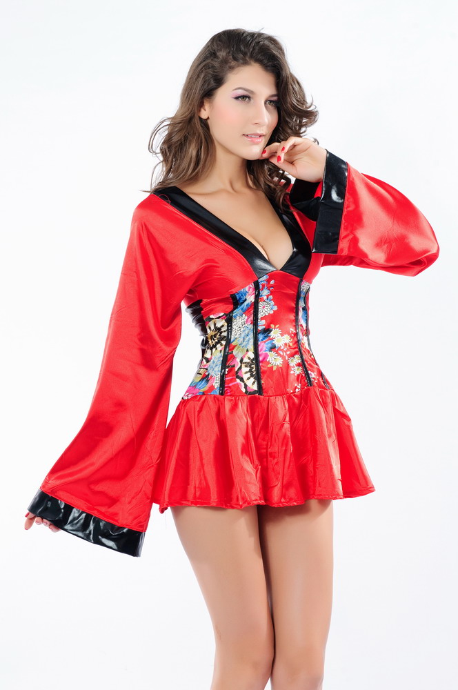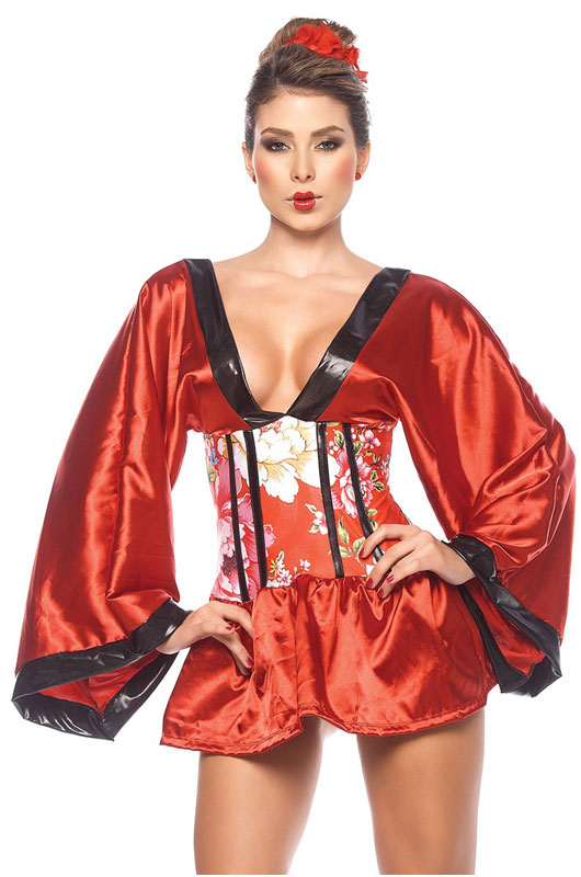 Have them bowing at your knees dressed to impress in this gorgeous new shanghai delight geisha costume. This sexy costume set features a long billow-sleeve kimono-inspired satin-look mini dress with low cut neckline, v-cut back, corset inspired waist cinching bodice with Japanese accented print and flowing mini skirted bottom. Headpiece not included. One size fits most.