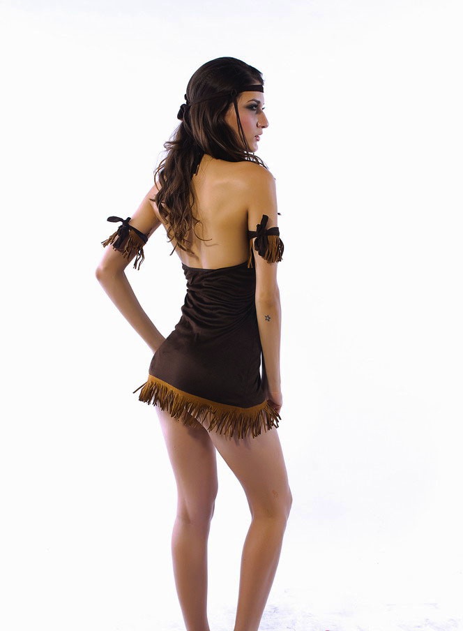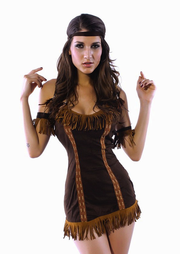 This 3-piece sexy Indian costume includes ultra suede dress, arm bands, and a headband with feathers. One size fits most.